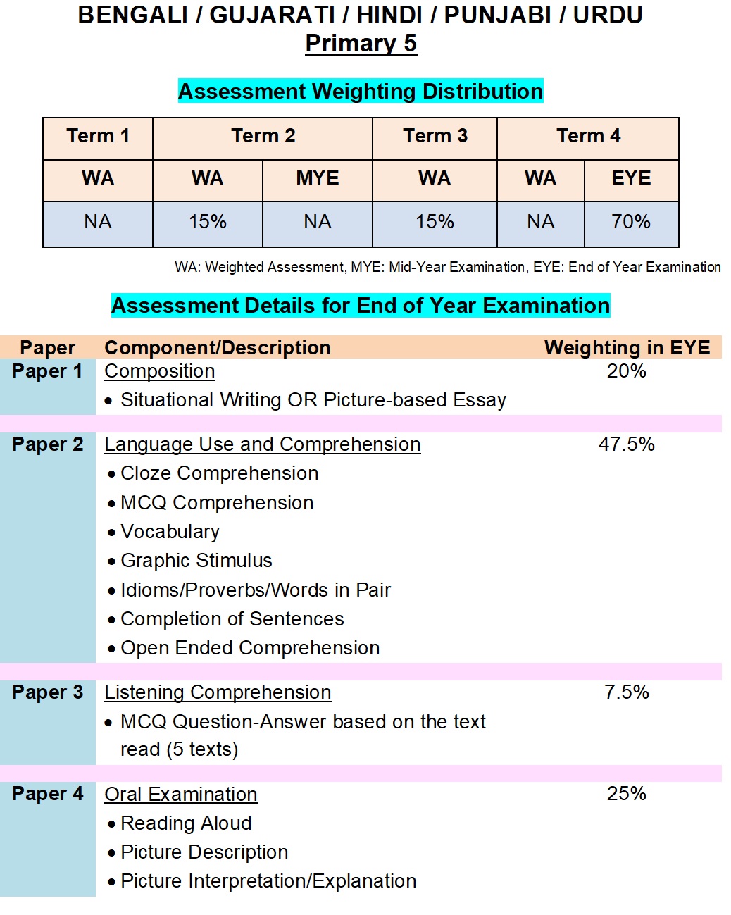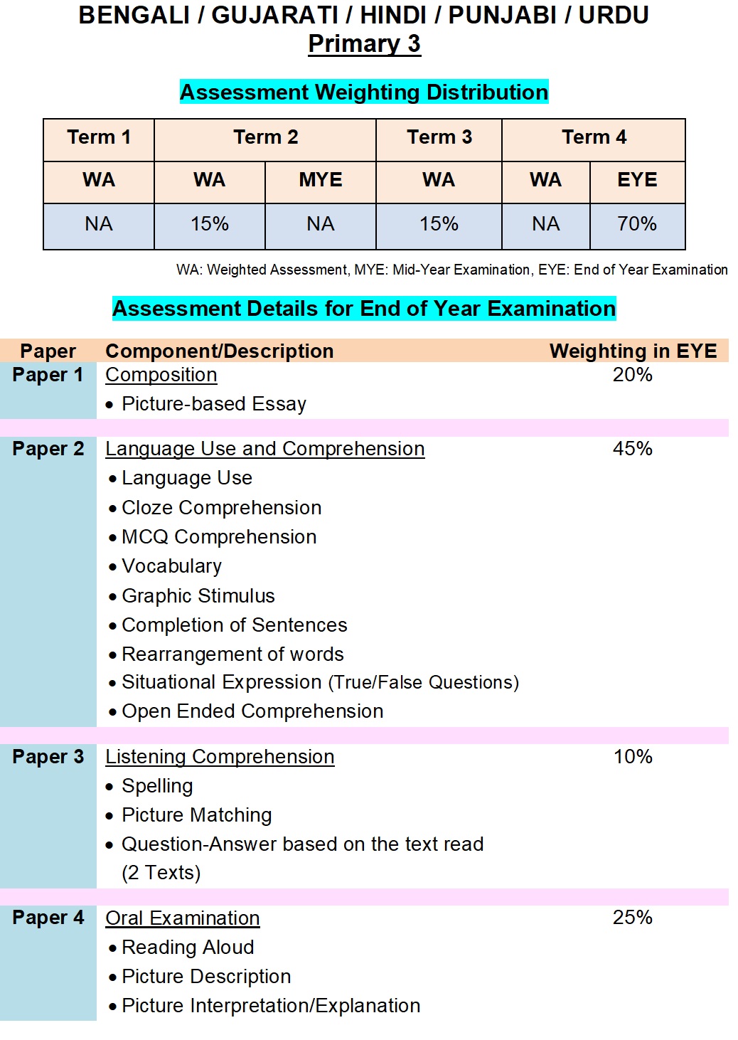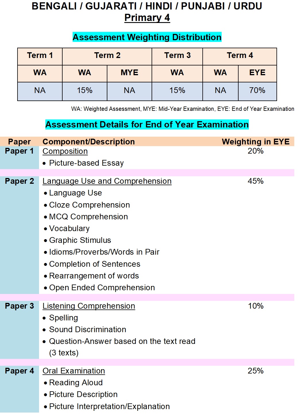 Examinations typically include a combination of written papers and oral assessments, aligned with the prescribed curriculum and learning outcomes. The assessment framework encourages confidence-building and steady language development among young learners.